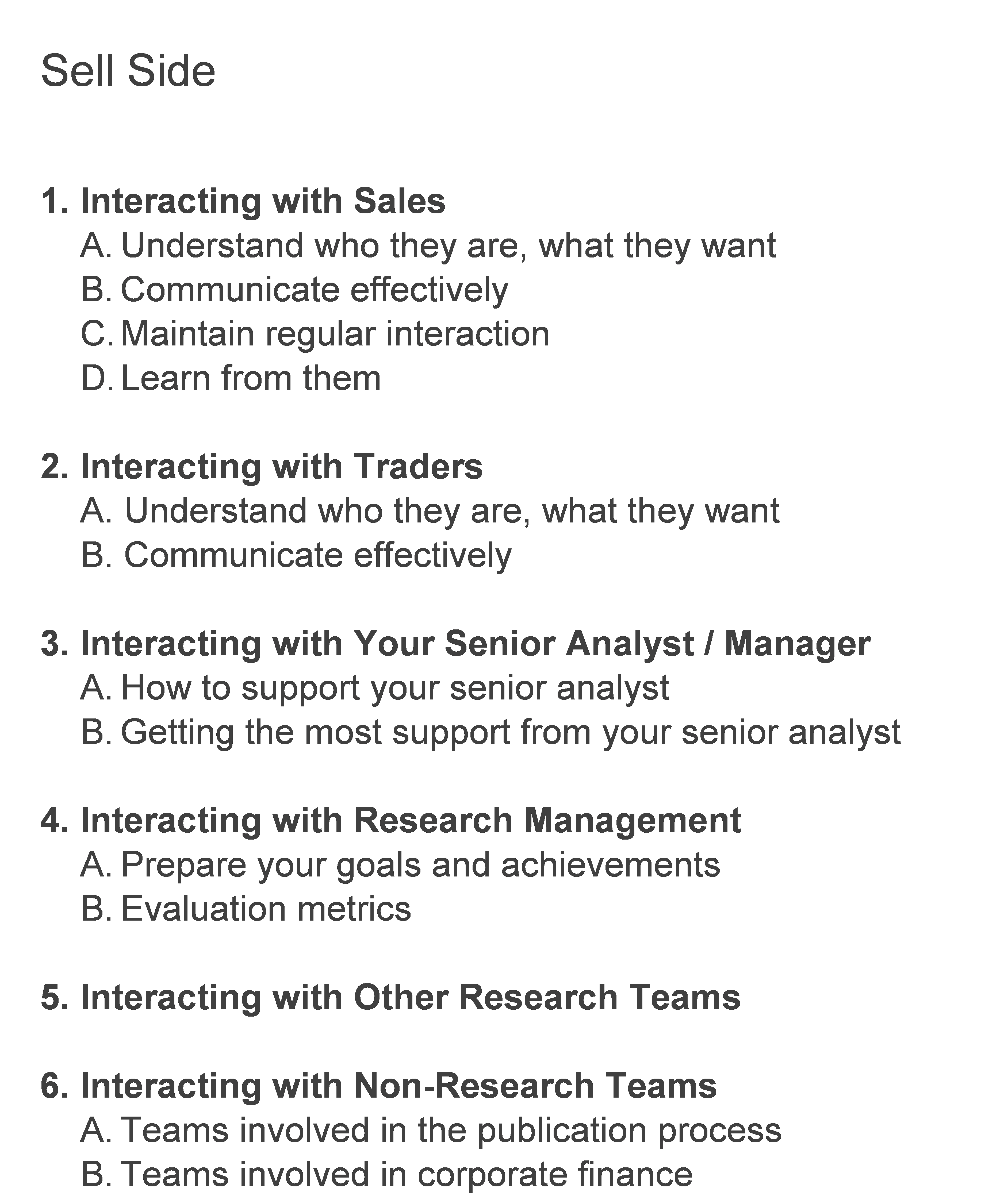 For the sell side, this module covers how to best interact with and present to sales and traders, how to interact with senior analysts and get appropriate support, how to communicate goals and achievements to research management and how to maintain good relationships with other research and non-research teams.