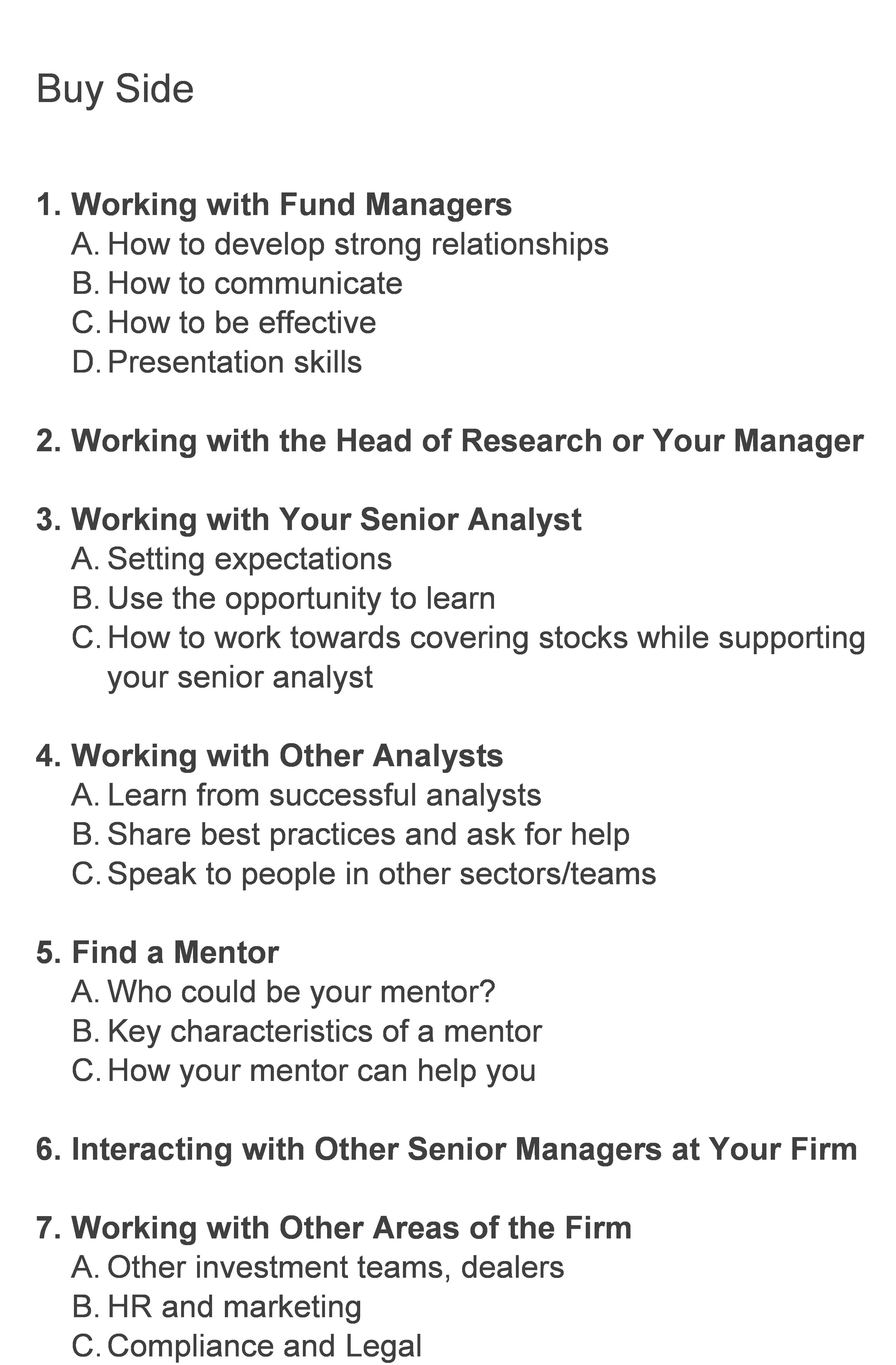 For the buy side, this module covers how to work with fund managers and other senior analysts, how to find a mentor and how to work with other areas of the firm.